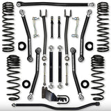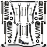 The Rock Krawler Suspension JL 2.5 inch X-Factor Mid-Arm System is specifically designed for Sport and Sahara owners who want a complete system, bolt-in installation, and the best articulation of any MID-ARM kit on the market. Our system proves its durability and off-road performance every time you hit the streets or trail! Our industry leading, X-Factor Series, adjustable upper and lower control arms offer a total of 95 degrees of misalignment when paired with our Pro-X Krawler Joints and Adventure Series joints. The inherent bind in a factory JL control arm is greatly reduced. Our maintenance free "Adventure Series" joints are found in your front and rear control arms at the frame connection, while our "PRO Krawler Joints" tie in your axle connections. With so much adjustability, it allows you to precision tune the JL's caster and pinion angle front and rear. Driving you home with the most comfortable ride possible in a Wrangler, are our TRIPLE RATE coils. All 4 coils work together to achieve excellent on-road comfort that we feel is better than the OEM linear rate springs. The coil itself is built with the proper "Free-length" for off-road articulation and stays firmly seated in the coil bucket (as long as a proper length shock is installed), and overall a very controlled reaction to bumps, rocks, sand, mud and whatever else you can manage to throw at them! All Rock Krawler JL systems include correction pads that reduce the spring bow inherent in the factory set up. The provided track bar geometry corrections, both front and rear, lets you perfectly center the axles so there is no compromise in on road handling.