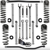 The Rock Krawler Suspension JLU 3.5 inch X-Factor PRO "No-Limits" Mid-Arm System is specifically designed for RUBICON owners who want a complete system, bolt-in installation, and the best articulation of any MID-ARM kit on the market. ALL 8 CONTROL ARMS ARE MADE FROM SOLID 7075 ALUMINUM, AND COME STANDARD WITH ALL BENEFITS OF X-FACTOR BUILT RIGHT IN. Our system proves its durability and off-road performance every time you hit the streets or trail! The Term, "No-Limits" comes from the inclusion of our front sway bar links specifically designed for use with the factory electronic sway bar disconnect feature found standard in your Rubicon Wrangler! The sway bar links themselves come with factory sized hardware, a CNC machined billet aluminum center section, and Made in USA heim joints from FK bearing, once installed, just press the button and hit the rocks! Our industry leading, X-Factor Series, adjustable upper and lower control arms offer a total of 95 degrees of misalignment when paired with our Pro-X Krawler Joints and Adventure Series joints. The inherent bind in a factory JL control arm is greatly reduced. Our maintenance free "Adventure Series" joints are found in your front and rear control arms at the frame connection, while our "PRO Krawler Joints" tie in your axle connections. With so much adjustability, it allows you to precision tune the JL's caster and pinion angle front and rear. Driving you home with the most comfortable ride possible in a Wrangler, are our TRIPLE RATE coils. All 4 coils work together to achieve excellent on-road comfort that we feel is better than the OEM linear rate springs. The coil itself is built with the proper "Free-length" for off-road articulation and stays firmly seated in the coil bucket (as long as a proper length shock is installed), and overall a very controlled reaction to bumps, rocks, sand, mud and whatever else you can manage to throw at them! All Rock Krawler JL systems include correction pads that reduce the spring bow inherent in the factory set up. The provided track bar geometry corrections, both front and rear, lets you perfectly center the axles so there is no compromise in on road handling.