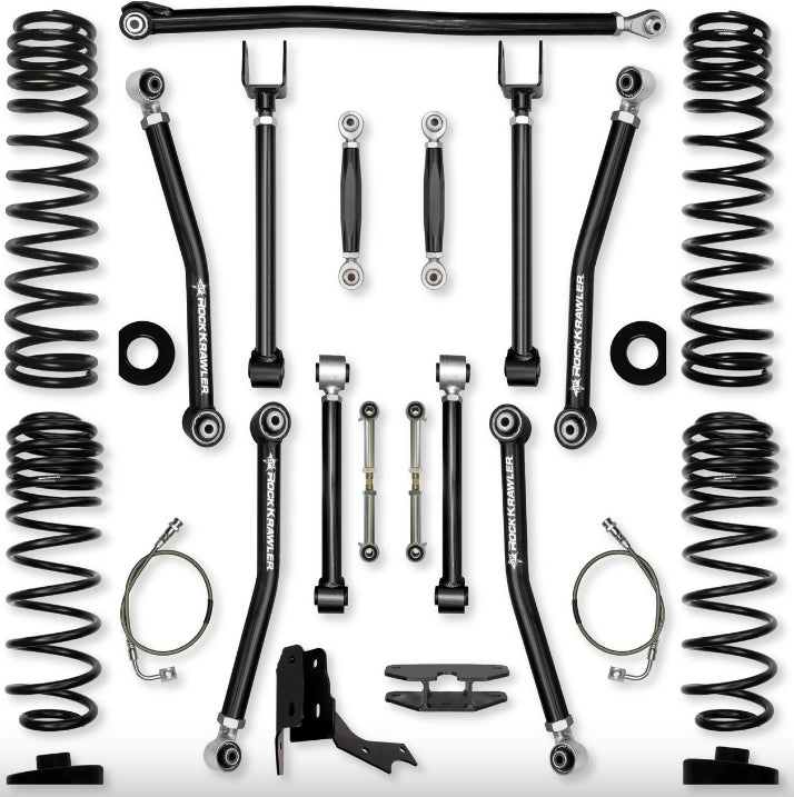 The Rock Krawler Suspension JT 4.5 inch ADVENTURE - X Mid-Arm System - DIESEL SPECIFIC is specifically designed for Rubicon owners who want a complete system, bolt-in installation, and some of the best articulation of any MID-ARM kit on the market. Our system proves its durability and off-road performance every time you hits the streets or trail! The Term, Adventure - X comes from the inclusion of 8 adjustable control arms with our 100% Service Free Adventure Series joints installed. Our industry leading, Adventure - X mid-Arms feature adjustable upper and lower control arms and offer a total of 70 degrees of misalignment when paired with our Adventure series Joints at the frame connection and at the axle. The inherent bind in a factory JL/JT control arm is greatly reduced. With so much adjustability, it allows you to precision tune the JT's caster and pinion angle front and rear. Driving you home with the most comfortable ride possible in a Gladiator, are our TRIPLE RATE front coils and QUAD RATE rear coils. All 4 coils work together to achieve excellent on-road comfort that we feel is better than the OEM springs. The coil itself is built with the proper "Free-length" for off-road articulation and stays firmly seated in the coil bucket (as long as a proper length shock is installed), and overall, a very controlled reaction to bumps, rocks, sand, mud and whatever else you can manage to throw at them! All Rock Krawler JT systems include correction pads that reduce the spring bow inherent in the factory set up. The provided track bar geometry corrections, both front and rear, lets you perfectly center the axles so there is no compromise in on road handling.