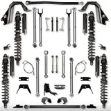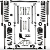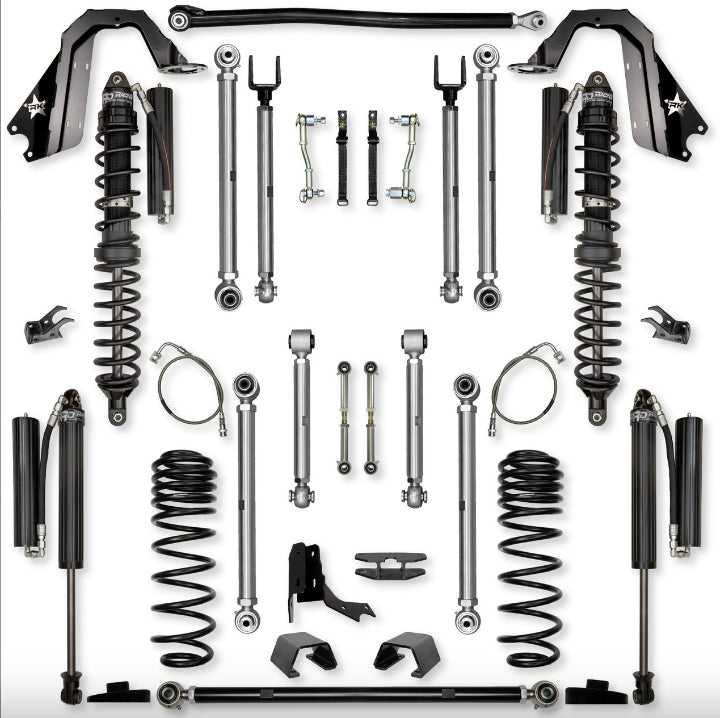 The Rock Krawler Suspension JT 4.5 inch DIESEL X-Factor PRO Mid-Arm System is specifically designed for Sport/Overland owners who want a complete system, bolt-in installation, and the best articulation of any MID-ARM kit on the market. ALL 8 CONTROL ARMS ARE MADE FROM SOLID 7075 ALUMINUM, AND COME STANDARD WITH ALL BENEFITS OF X-FACTOR BUILT RIGHT IN. Our system proves its durability and off-road performance every time you hit the streets or trail! Our industry leading, X-Factor Series, adjustable upper and lower control arms offer a total of 95 degrees of misalignment when paired with our Pro-X Krawler Joints and Adventure Series joints. The inherent bind in a factory JT control arm is greatly reduced. Our maintenance free "Adventure Series" joints are found in your front and rear control arms at the frame connection, while our "PRO Krawler Joints" tie in your axle connections. With so much adjustability, it allows you to precision tune the JT's caster and pinion angle front and rear. Driving you home with the most comfortable ride possible in a Gladiator, are our TRIPLE RATE front coils/QUAD RATE rear coils. All 4 coils work together to achieve excellent on-road comfort that we feel is better than the OEM linear rate springs. The coil itself is built with the proper "Free-length" for off-road articulation and stays firmly seated in the coil bucket (as long as a proper length shock is installed), and overall a very controlled reaction to bumps, rocks, sand, mud and whatever else you can manage to throw at them! All Rock Krawler JL systems include correction pads that reduce the spring bow inherent in the factory set up. The provided track bar geometry corrections, both front and rear, lets you perfectly center the axles so there is no compromise in on road handling.