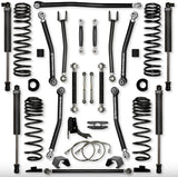 The Rock Krawler Suspension JT 4.5 inch X-Factor "No-Limits" Mid-Arm System is specifically designed for Rubicon owners who want a complete system, bolt-in installation, and the best articulation of any MID-ARM kit on the market. Our system proves its durability and off-road performance every time you hit the streets or trail! "No-Limits" comes from the inclusion of our front sway bar links specifically designed for use with the factory electronic sway bar disconnect feature found standard in your Rubicon Gladiator! The sway bar links themselves come with factory sized hardware, a CNC machined billet aluminum center section, and Made in USA heim joints from FK bearing, once installed, just press the button and hit the rocks! Our industry leading, X-Factor Series, adjustable upper and lower control arms offer a total of 95 degrees of misalignment when paired with our Pro-X Krawler Joints and Adventure Series joints. The inherent bind in a factory JL/JT control arm is greatly reduced. Our maintenance free "Adventure Series" joints are found in your front and rear control arms at the frame connection, while our "PRO Krawler Joints" tie in your axle connections. With so much adjustability, it allows you to precision tune the JT's caster and pinion angle front and rear. Driving you home with the most comfortable ride possible in a Wrangler, are our TRIPLE RATE front coils/QUAD RATE rear coils. All 4 coils work together to achieve excellent on-road comfort that we feel is better than the OEM linear rate springs. The coil itself is built with the proper "Free-length" for off-road articulation and stays firmly seated in the coil bucket (as long as a proper length shock is installed), and overall a very controlled reaction to bumps, rocks, sand, mud and whatever else you can manage to throw at them! All Rock Krawler JL systems include correction pads that reduce the spring bow inherent in the factory set up. The provided track bar geometry corrections, both front and rear, lets you perfectly center the axles so there is no compromise in on road handling.
