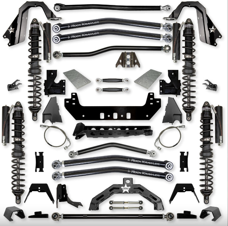 The Rock Krawler Suspension JT 4.5 inch X-Factor X2 "No-Limits" Long-Arm System is specifically designed for Gladiator owners who want to push their vehicle to its limits with hard core rock crawling. "No-Limits" comes from the inclusion of our front sway bar links specifically designed for use with the factory electronic sway bar disconnect feature found standard in your Rubicon Gladiator! The sway bar links themselves come with factory sized hardware, a CNC machined billet aluminum center section, and Made in USA heim joints from FK bearing, once installed, just press the button and hit the rocks! The Rock Krawler X2 3-Link Longarm System features an Independent 3 link design front & rear for maximum articulation and off-road performance. Our proprietary design utilizes a double adjustable front and rear upper control arm that upsizes the factory hardware to 14mm, 2 3/8" mounting width and 1" Pro Krawler joints at each end. The arm itself is a chromoly solid steel arm meant to carry all the forces of the suspension. The rear suspension provides adjustable anti-squat with "X2" rear suspension geometry with enhanced rear instant center(s) and rear roll center(s). As you drive the highways or the trails, the system feels stable, safe and strong whether you are running the stock drivetrain or pushing high horsepower through the chassis. We have built the X-Factor X2 system to be the toughest 3-Link setup on the market. At the frame connections of the lower control arms, our "Adventure Series" maintenance free joint is used to cut down on the amount of grease points, and provide excellent vibration absorption and proper joint misalignment when off-road. The combination of high clearance long arms and 3 link suspension geometry lets you dominate the trails.